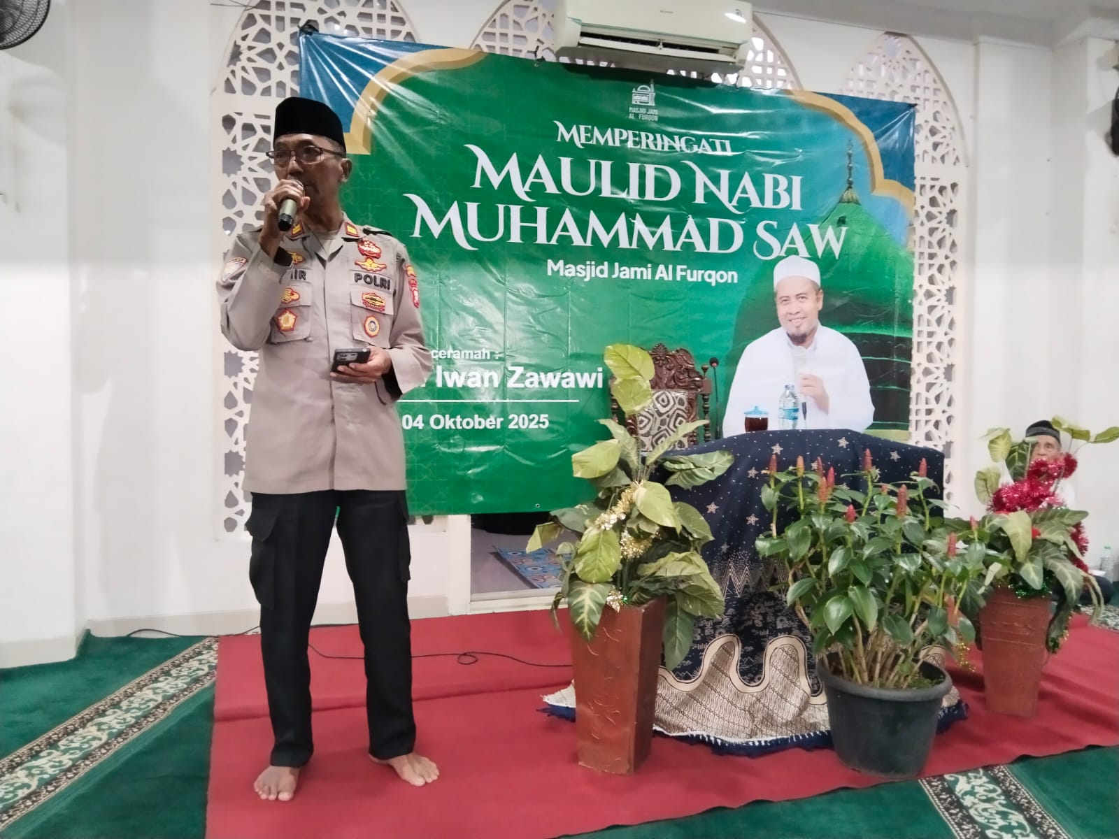 Nasional.id, Jakarta – Dalam rangka memperingati Maulid Nabi Muhammad SAW 1447 H / 2025 M, jajaran Polsek Matraman menghadiri kegiatan keagamaan yang digelar di Masjid Jami Al Furqon, Jalan Penegak Gang II RT 10/02, Kelurahan Palmeriam, Kecamatan Matraman, Jakarta Timur, pada Sabtu malam (04-10-2025).