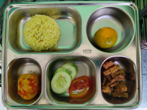 Untuk menu makanan bergizi yang dibagikan meliputi nasi kuning, telur balado, tempe orek, timun tomat, dan jeruk.