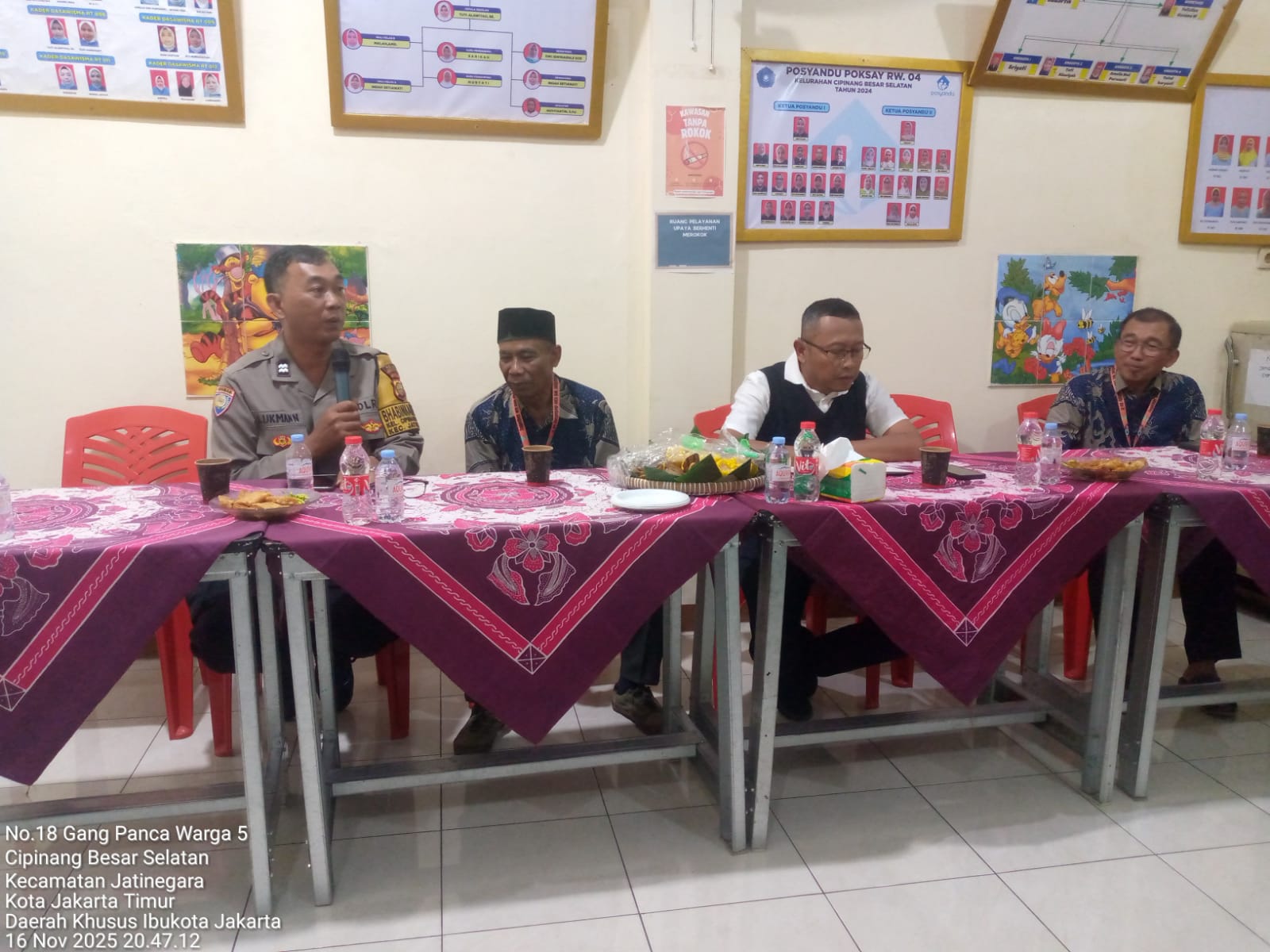 Pada kesempatan ini, Kapolsek Jatinegara Kompol Samsono, S.H., M.H. diwakili oleh Bhabinkamtibmas Aiptu Lukman N, yang berinteraksi langsung dengan pengurus lingkungan RW 04 serta warga sekitar. Hadir pula Lurah Cipinang Besar Selatan, LMK, para ketua RT, ibu-ibu kader, Satpol PP, dan FKDM.