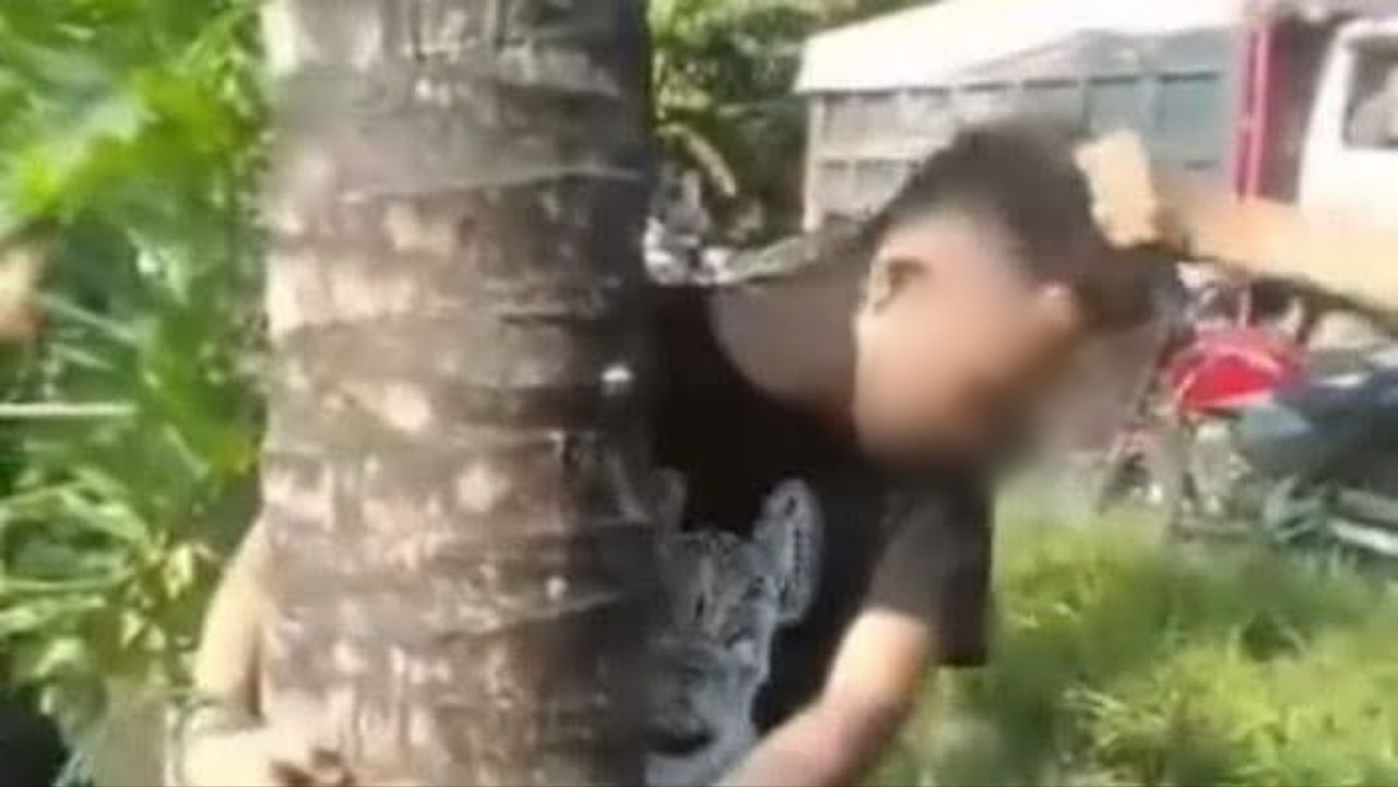 Junanta diikat di pohon kelapa oleh warga di Jalan Bangau, Kelurahan Mencirim, Kecamatan Binjai Timur, Kota Binjai, Sumut, Sabtu pagi (9/8/2025).